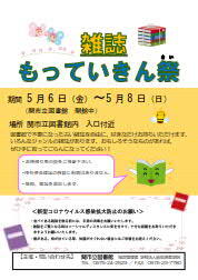 内容:図書館で不要になった古い雑誌を自由に、好きなだけお持ちいただけます。