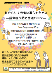 内容:自分らしく元気に暮らすために、認知症予防の視点から食事、運動、人との関わりなど、日常生活でできる工夫や生活のコツについてお話します。