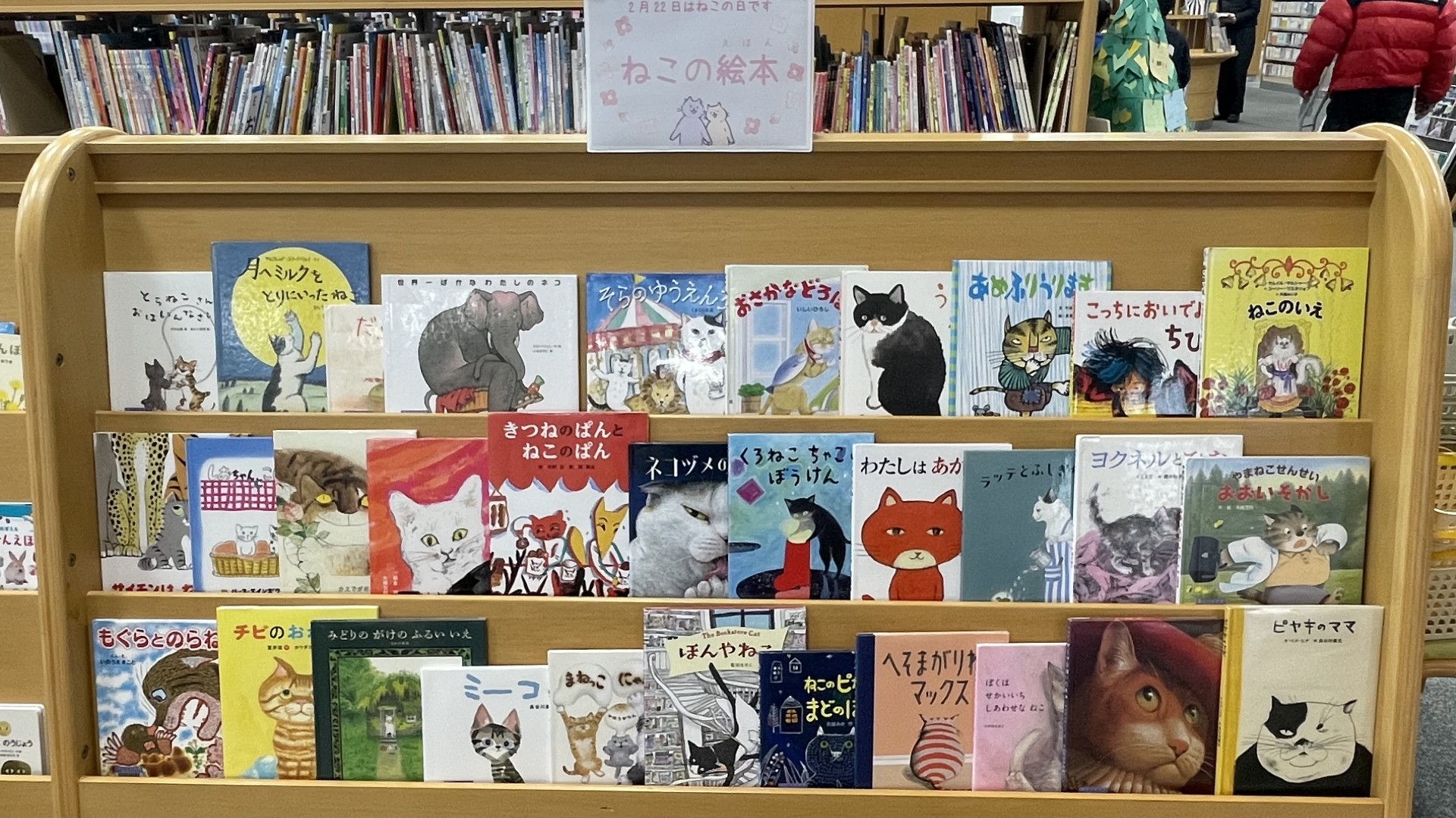 絵本コーナーでは2月22日ネコの日にちなんで「ねこのおはなし」を紹介しています。